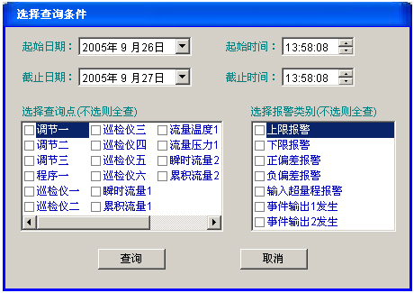 (3)報警:變頻器、溫度、濕度、風(fēng)壓發(fā)生異常報警時,相應(yīng)的顯示會發(fā)生閃爍及聲音報警點擊消除;同時選擇各類報警并記錄報表;提供打印功能。