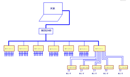 整個空調(diào)數(shù)據(jù)采集、監(jiān)控系統(tǒng)由一臺上位PC機、1個宇電RS232/RS485轉(zhuǎn)換器、7臺AI人工智能高精度6路巡檢儀、37個鉑熱電阻Pt100、4個流量傳感器及一個壓差變送器組成。利用具有通訊功能的AI-706M6路巡檢儀對現(xiàn)場數(shù)據(jù)進行采集,測量精度為0.2級。在巡檢儀上可直接顯示采集的數(shù)據(jù),并通過RS-485串行通訊和上位機進行通訊,實現(xiàn)37個通道溫度、4個通道流量及1個通道壓差的集中監(jiān)控。AI調(diào)節(jié)器上的所有參數(shù)可以在上位機中顯示,也可用上位機設定下載。