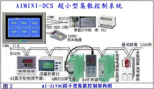 AIMINI-DCS超小型集散溫濕度監(jiān)控系統(tǒng)采用上位機(jī)(觸摸屏)與下位機(jī)(AI儀表)總線連接,按地址排列,AI儀表相互獨(dú)立運(yùn)行、互不干擾、通電就能顯示操作;每臺(tái)記錄儀可選擇1~32臺(tái)調(diào)節(jié)、顯示儀表;可連接AI-808H溫壓補(bǔ)償流量表4臺(tái);1臺(tái)601電量?jī)x表。連接AI-3013D5模塊1個(gè),8個(gè)開關(guān)量輸出控制電機(jī)起停;連接AI-3011D5模塊1個(gè),8個(gè)開關(guān)輸入顯示電機(jī)運(yùn)行狀態(tài);觸摸屏COM1通訊口采用【超5類屏蔽雙絞線】2根線來連接AI儀表的通訊口A/B端RS485通訊;中間不能用其他的導(dǎo)線來連接;安裝開關(guān)電源直流24VDC供電,電源線+、-兩根線、接地線。COM2通訊口具有隨機(jī)打印功能,或定制以太網(wǎng)功能:應(yīng)用數(shù)據(jù)同步與計(jì)算機(jī)軟件通訊實(shí)時(shí)監(jiān)控?cái)?shù)據(jù)。應(yīng)用各類組態(tài)軟件來實(shí)現(xiàn)數(shù)據(jù)遠(yuǎn)程監(jiān)控 。