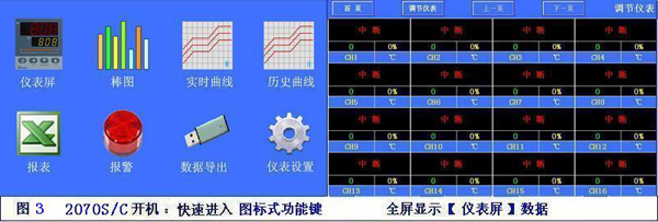 AIMINI-DCS超小型集散溫濕度監(jiān)控系統(tǒng)的操作方式:軟件界面有固定的觸摸按鍵點(diǎn)【開始】出現(xiàn)目錄條顯示【數(shù)據(jù)】【流量數(shù)據(jù)】【實(shí)時(shí)曲線】、【棒圖】、【實(shí)時(shí)多曲線】、【歷史曲線】、【流程圖】【歷史報(bào)表】、【報(bào)警報(bào)表】【儀表設(shè)置】【記錄設(shè)置】【前頁】【后頁】【手動(dòng)/自動(dòng)】翻頁、【參數(shù)設(shè)置】【程序設(shè)置】;控制程序的【啟動(dòng)】【暫?!俊就V埂康裙潭ǖ牟僮鞣椒ā?br/> AIMINI-DCS超小型集散溫濕度監(jiān)控系統(tǒng)采用盤面安裝方式, AI儀表采用盤面或?qū)к壈惭b方式;通訊線采用【超5類屏蔽雙絞線】,安裝24VDC開關(guān)電源。開機(jī)進(jìn)入圖標(biāo)式功能選擇畫面;【主頁】上顯示圖標(biāo)【調(diào)節(jié)儀表】、【流量?jī)x表】【電量?jī)x表】、【報(bào)警記錄】、【棒圖】、【流程圖】、【報(bào)表】、【數(shù)據(jù)導(dǎo)出】、【單條曲線】【實(shí)時(shí)曲線】、【歷史曲線】、【設(shè)置】、點(diǎn)擊進(jìn)入該功能畫面;