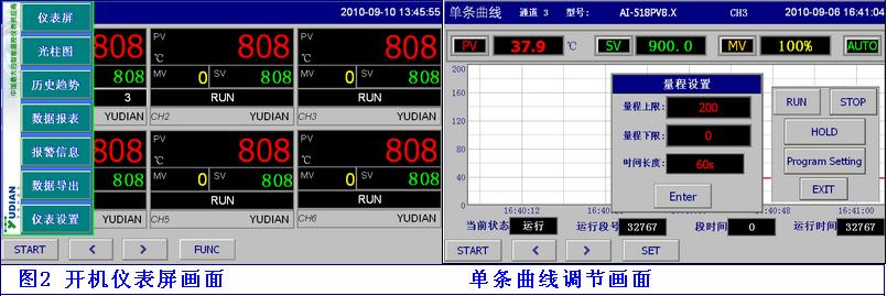 在屏上控制操作程序儀表【啟動(dòng)】【停止】【暫?!?、在運(yùn)行狀態(tài)下切換【手動(dòng)/自動(dòng)】狀態(tài),手動(dòng)控制輸出量;即時(shí)修改【段號(hào)】,指定運(yùn)行段;及修改儀表控制參數(shù)等多種功能;追憶記錄的溫度曲線數(shù)據(jù)。數(shù)據(jù)報(bào)表、報(bào)警報(bào)表的打印。